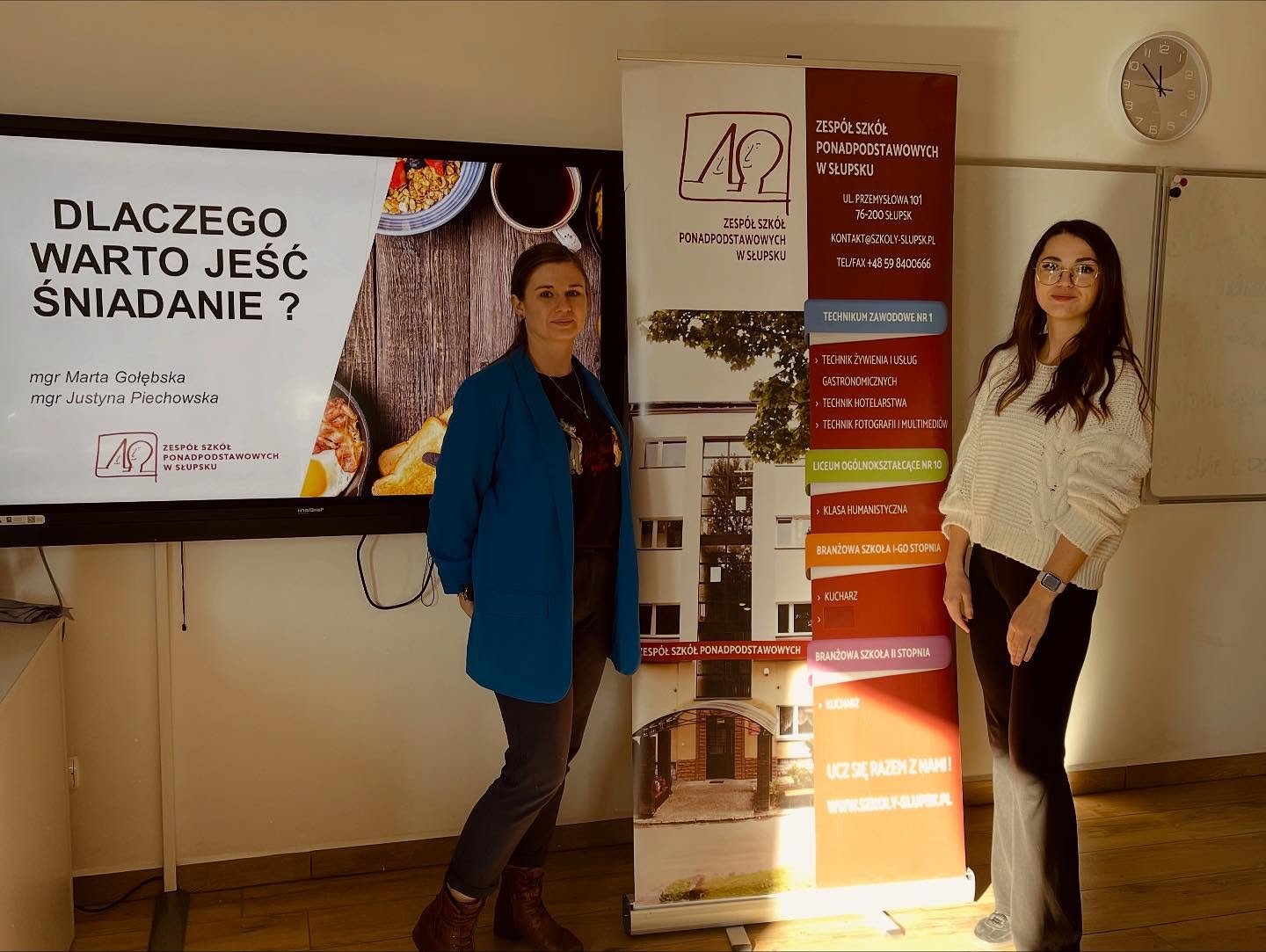 W ramach obchodów Europejskiego Dnia Zdrowego Jedzenia i Gotowania, który przypada 8 listopada, nasze nauczycielki – pani Marta Gołębska i pani Justyna Piechowska – odwiedziły Szkołę Podstawową im. Jana Kochanowskiego w Kończewie, aby przeprowadzić zajęcia z zakresu edukacji żywieniowej. Dla uczniów klasy 7, w ramach przedmiotu edukacja zdrowotna, przygotowały prelekcję pt. „Dlaczego warto jeść śniadanie?”. Zajęcia połączono z elementami hotelarstwa, dzięki czemu uczniowie mogli nie tylko poznać znaczenie śniadania dla zdrowia i koncentracji, ale także dowiedzieć się, jak komponować i estetycznie serwować ten ważny posiłek. W przedszkolu odbyły się natomiast pełne radości zajęcia o warzywach i owocach, które zachęcały najmłodszych do budowania zdrowych nawyków żywieniowych od najmłodszych lat. Serdecznie dziękujemy za zaproszenie i ciepłe przyjęcie!