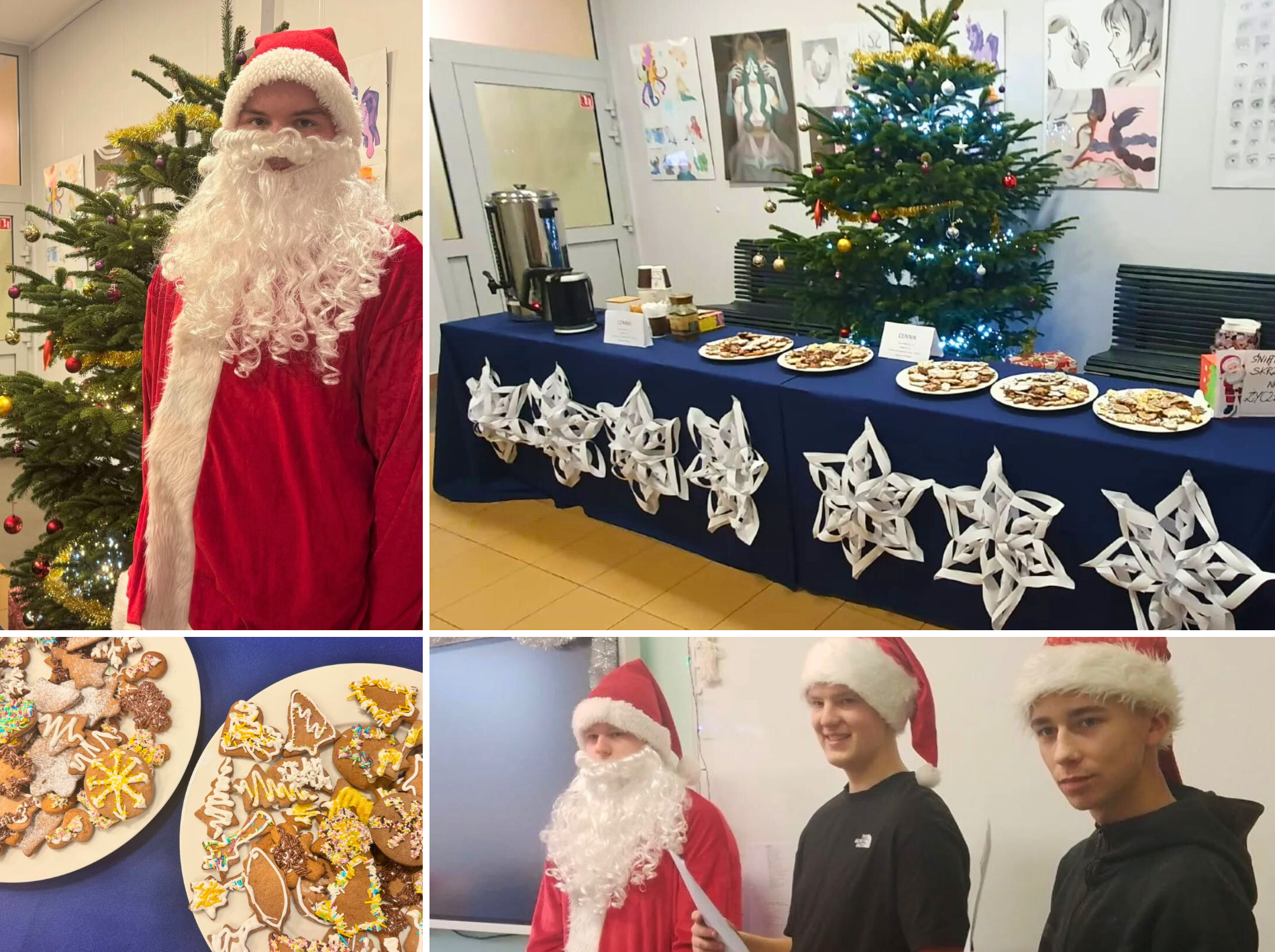 Kiermasz pierniczków i zagadki Mikołaja – dzień pełen świątecznych atrakcji! Sam Święty wraz ze swoimi pomocnikami odwiedzał sale, zadając uczniom świąteczne zagadki. Każdy, kto udzielił poprawnej odpowiedzi, otrzymywał złoty kupon na pyszne pierniczki lub rozgrzewającą herbatę. W przygotowanie pierniczków zaangażowali się uczniowie klasy 3A pod czujnym okiem pana Huberta Kiełbasy. Zdjęcia dokumentujące wydarzenie wykonały Sofia (1F) i Anastasiya (2F), a filmik: Katsiaryna (1F). Dzień pełen zabawy i świątecznego nastroju na długo pozostanie w naszej pamięci!